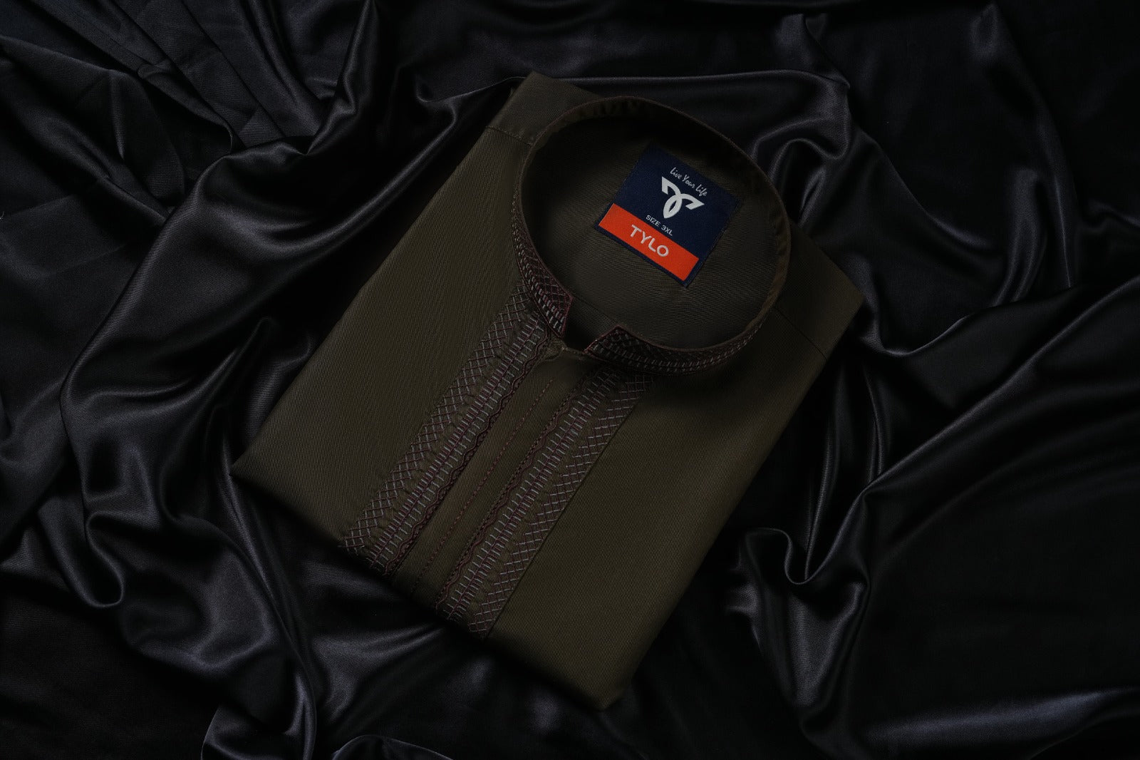 Style: Modern earthy tone with sophisticated monochromatic embroidery.